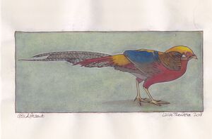 2018De vriendin van de pauwen heeft ook goudfazanten. Deze kwam aanlopen in zijn eentje, en toen hebben ze via Marktplaats een meisje voor hem gekocht. Nu is er een gezinnetje. Ze wonen met zijn allen in een groot hok met struikhgewas. Pa Goudfazant is héél dominant.